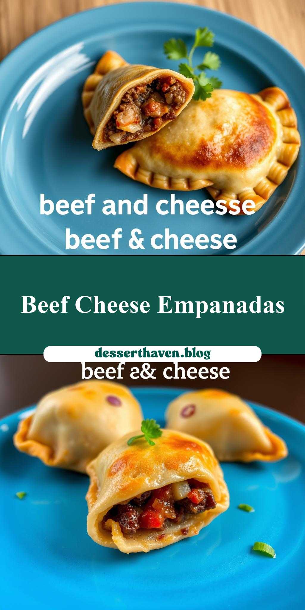 beef and cheese empanadas on a blue plate with text overlay that reads beef and cheese empanadas