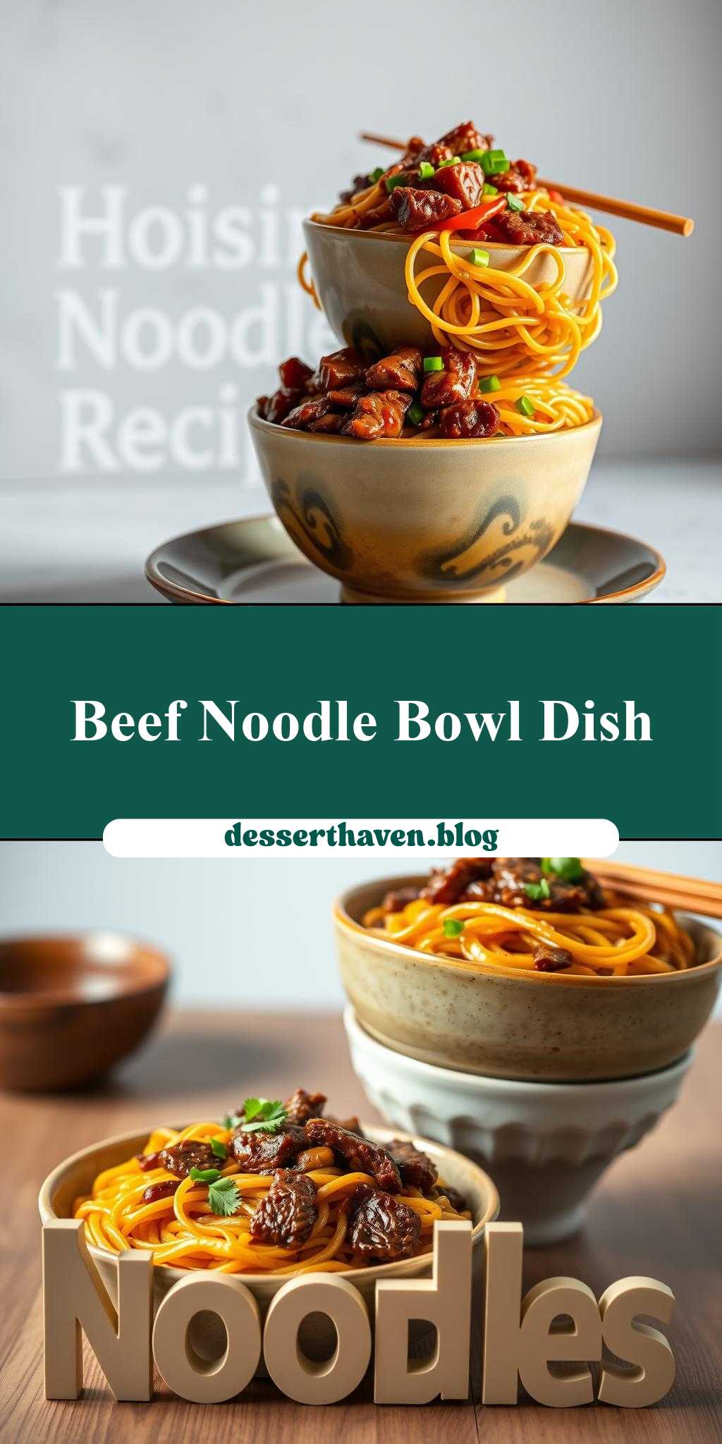 two bowls filled with noodles and beef on top of each other, in front of the words hoisin beef noodles recipe