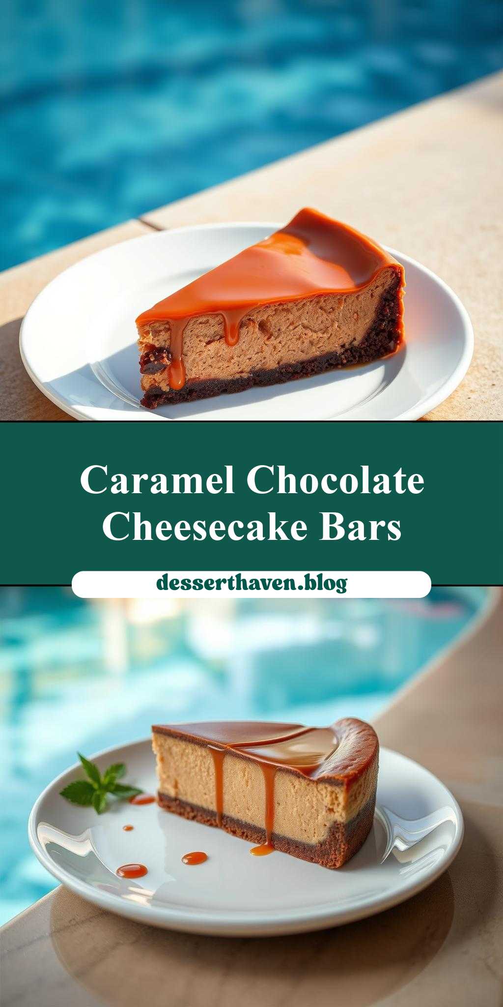 caramel chocolate cheesecake on a white plate next to a swimming pool with text overlay