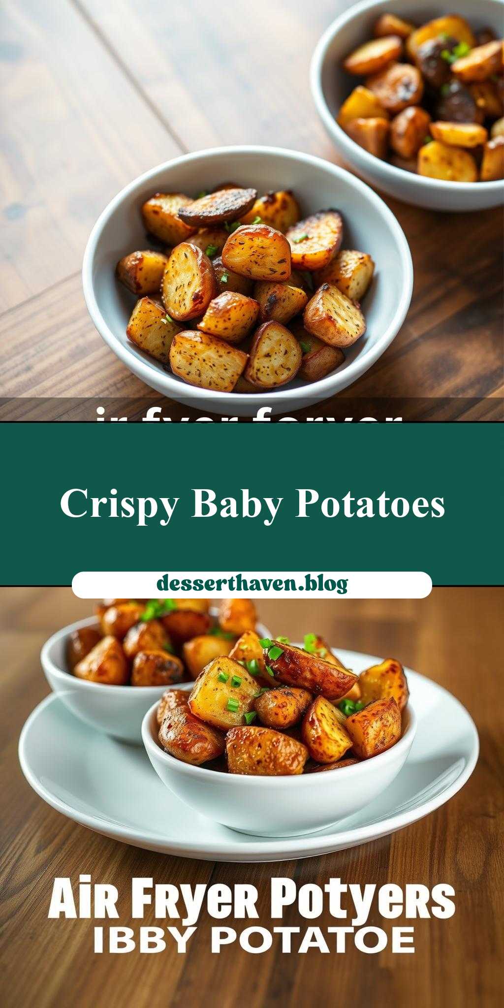 crispy air fryer baby potatoes in white bowls on a wooden table with text overlay