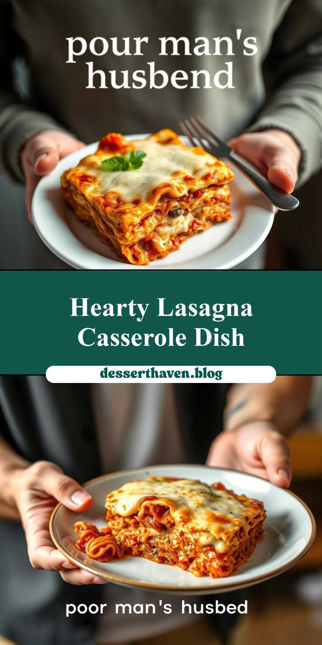 a person holding a plate with lasagna casserole on it, and the text poor man’s husband casserole