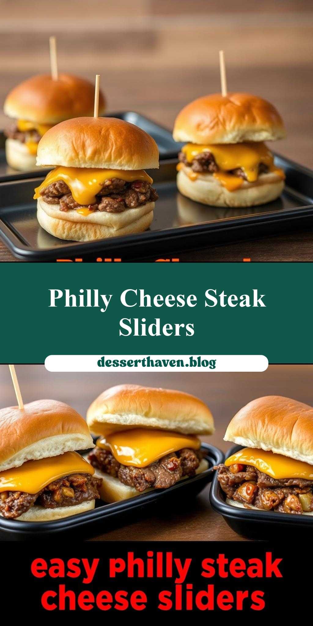three cheesesteak sliders on black trays with red text that reads easy philly cheese steak sliders