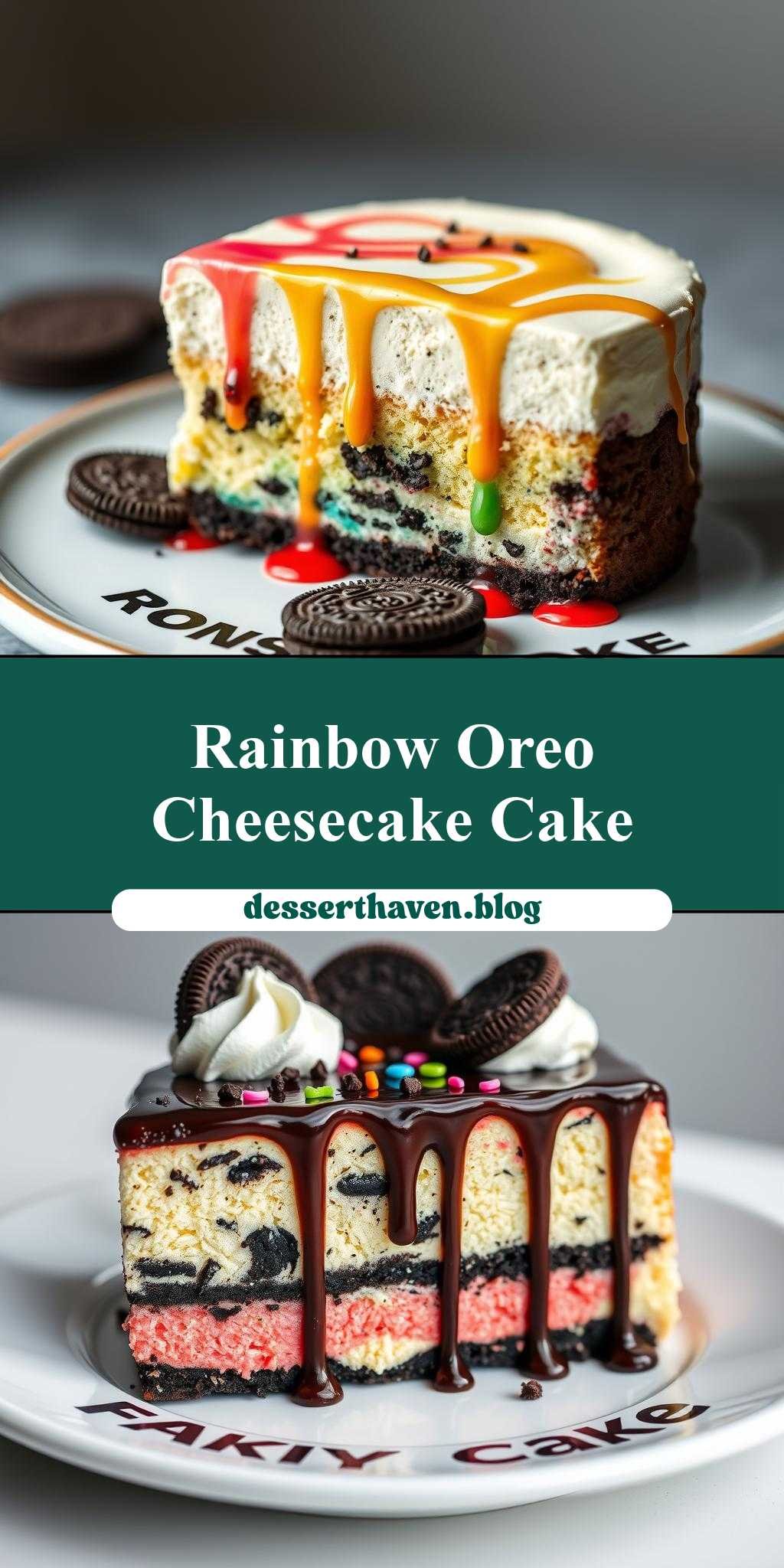 - Step 4: For the final touches, you can add whipped cream on top or sprinkle with crushed Oreos. To write “rainbow oreo cheesecake drip cake” on the plate, use chocolate syrup or melted chocolate. Simply pipe the words onto the plate and let them set before serving.