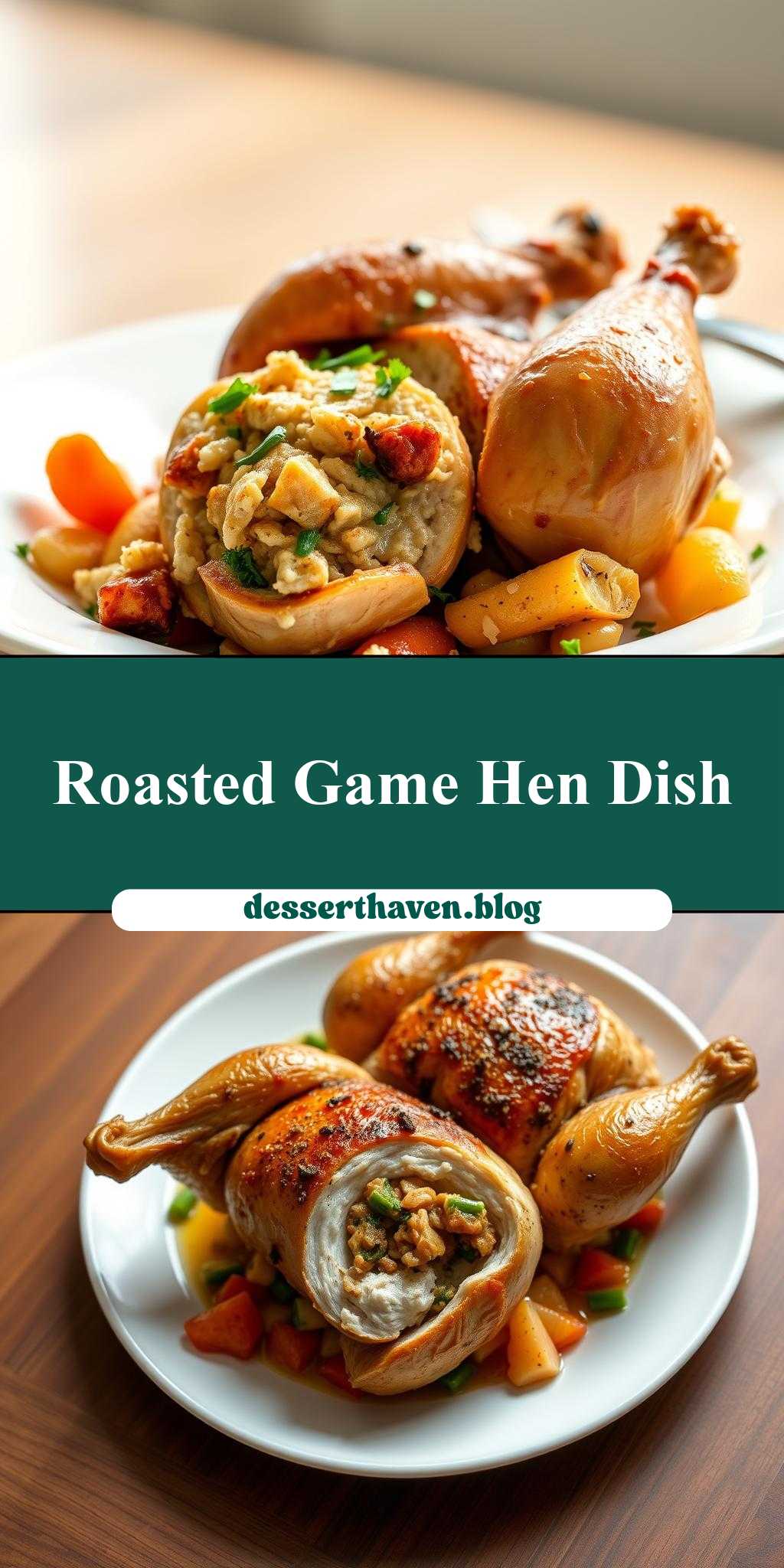 - Step 4: Place the stuffed game hens on a baking sheet lined with parchment paper, brush them with olive oil, and season with salt and pepper. Bake in the preheated oven for about 45 minutes, or until the hens are cooked through and the skin is golden brown. The final step involves letting the hens rest for a few minutes before serving, which helps retain their juices and tenderness.