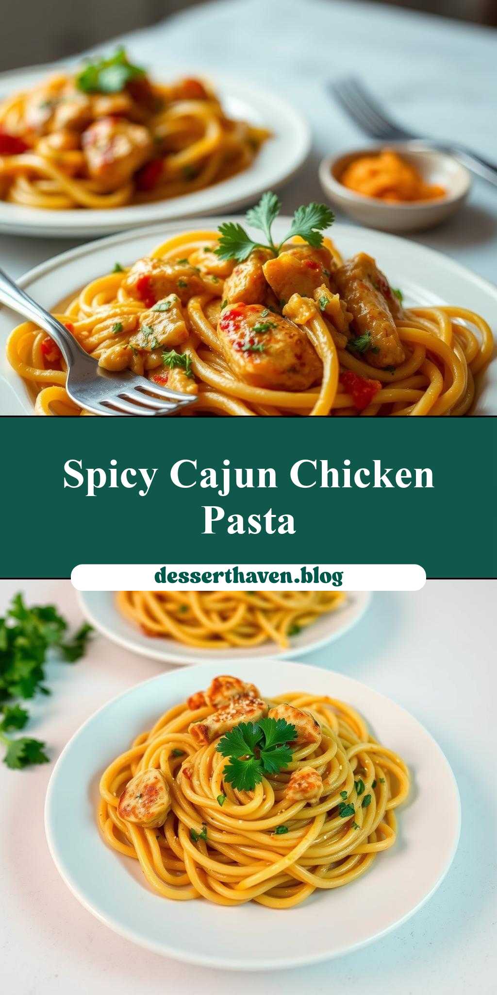 two plates of chicken fettuccine with parsley on top and the words spicy cajun chicken fettuccine above