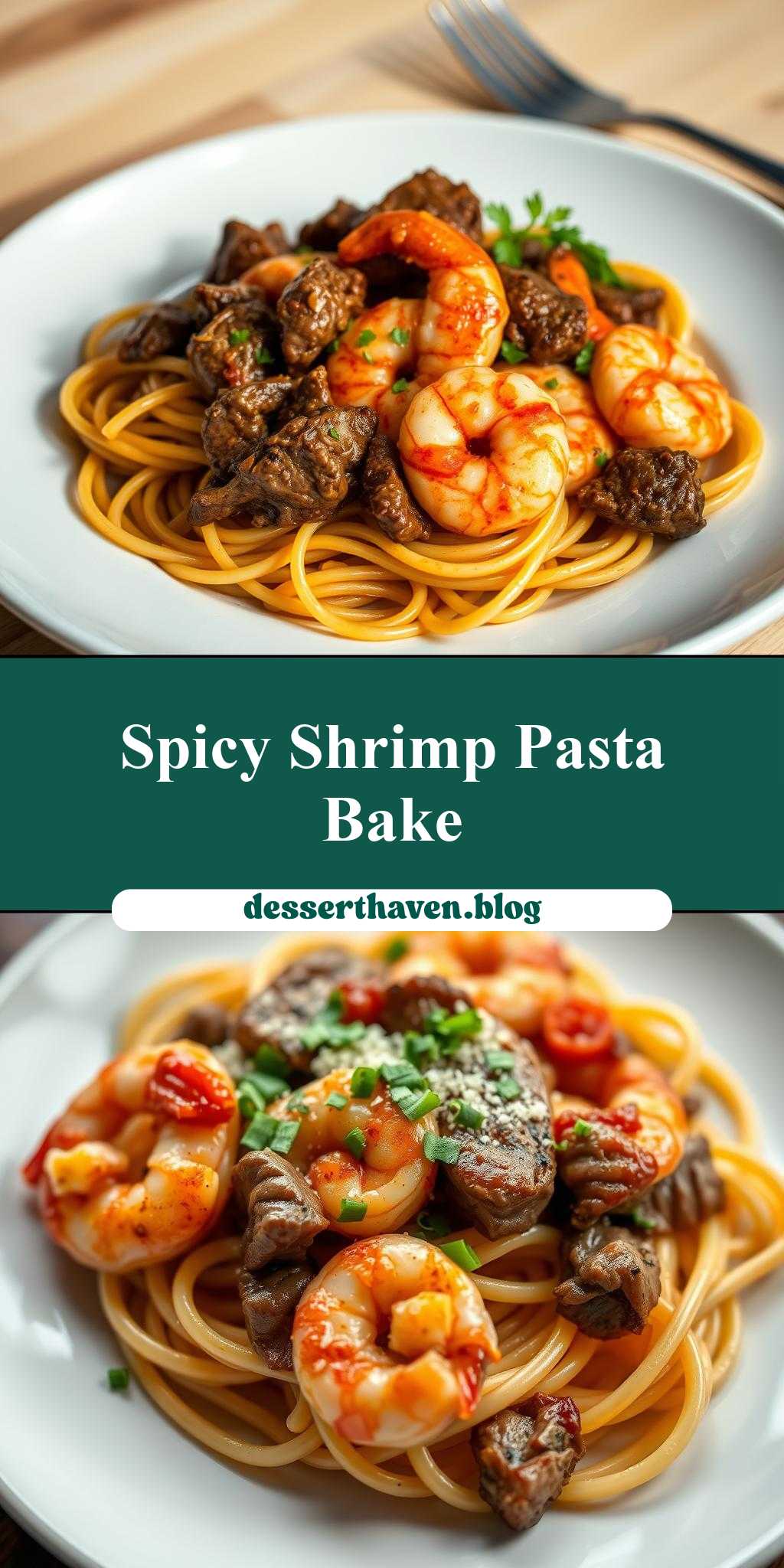 A spicy and savory pasta dish combining steak, shrimp, and the comfort of pasta, perfect for special occasions or a cozy night in.