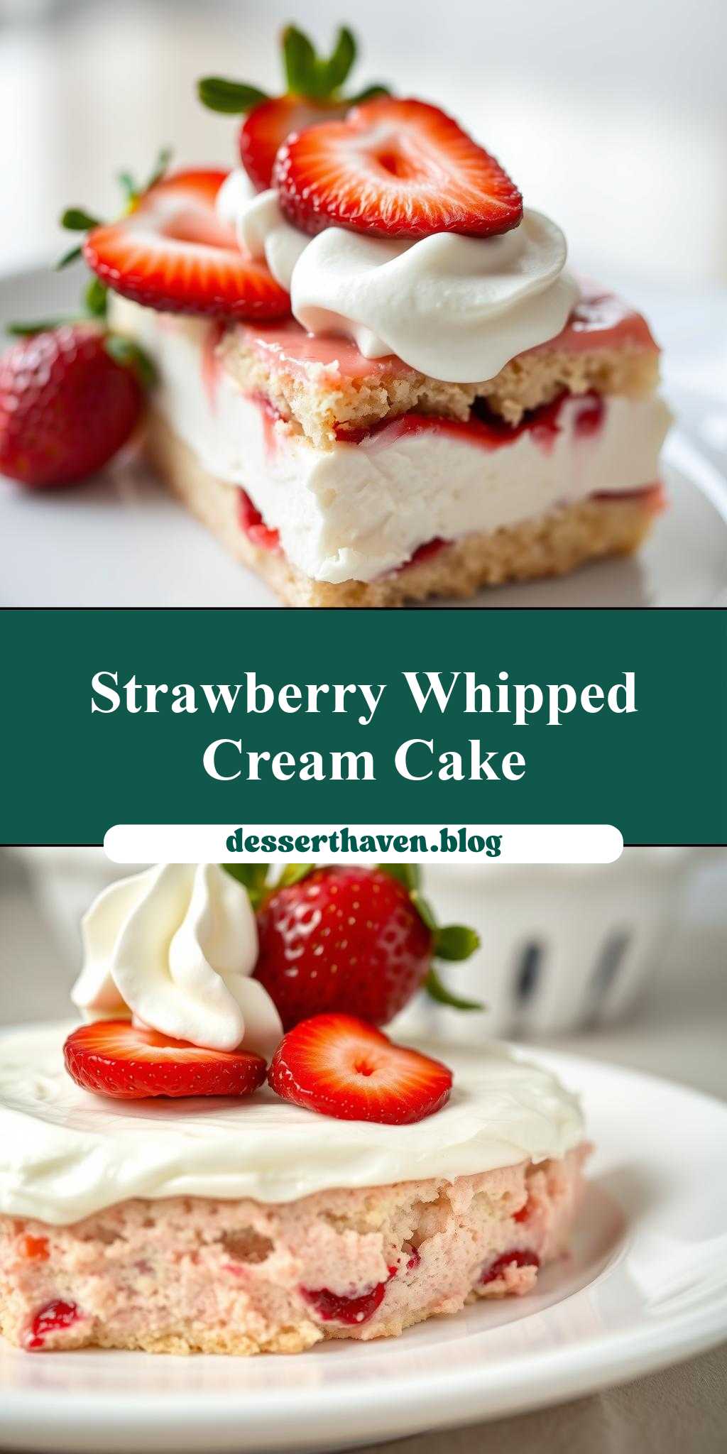 A moist and flavorful strawberry poke cake topped with whipped cream and fresh strawberries, perfect for any occasion.