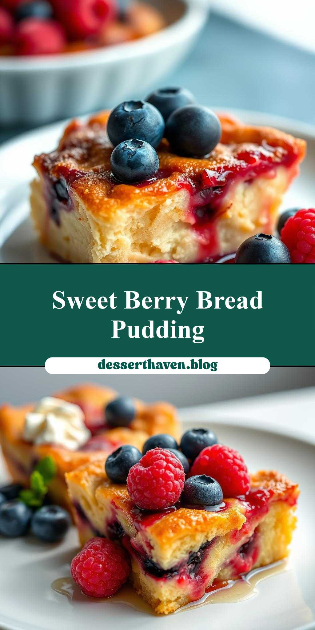 two pictures of bread pudding with blueberries and raspberries on top, the first has